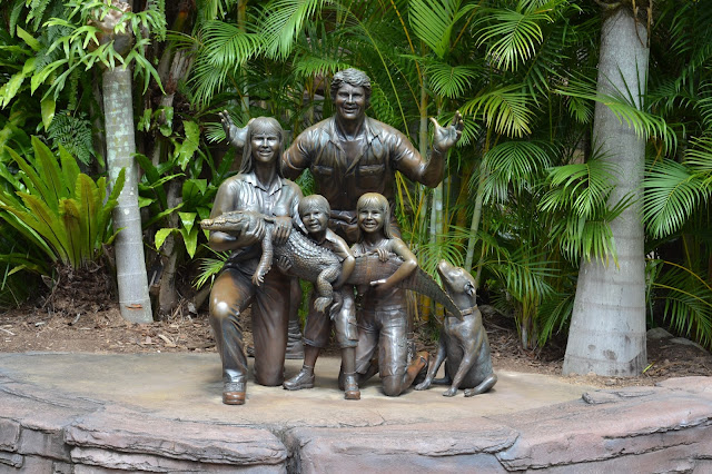 Patsas Irwinien perheestä eläinpuiston sisäänkäynnillä.