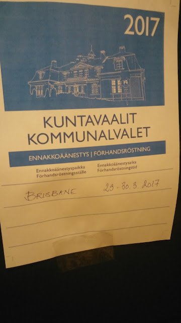 Viimeisen Austalia-viikon suunnitelmat eivät ihan menneet putkeen. Viimeviikon viikonloppu ja maanantai olivat huippupäiviä eläintarhoineen ja telttailuineen, mutta lähes heti sen jälkeen alkoi sykloni Debbie. Aluksi sen piti olla vain tuolla jossain ylhäällä, Brisbanesta 1300 kilometriä ylöspäin, mutta yhtäkkiä Brisbane tulvi eikä uskaltanut lähteä kauas. Sykloni itse kuoli jo suht nopeasti kun se rantautui, mutta se toi kovat rankkasateet Brisbaneen. Kaupat ja koulut olivat kiinni ja tiet oli suljettu tulvien vuoksi. Emme siis päässeet enää lähtemään Sunshine Coastille tai muualle tekemään reissua, joten ajelimme vain tässä lähellä, muun muassa Austalian Suomen konsulaatissa äänestämässä ja aavemaisen tyhjässä kauppakeskuksessa pyörimässä.