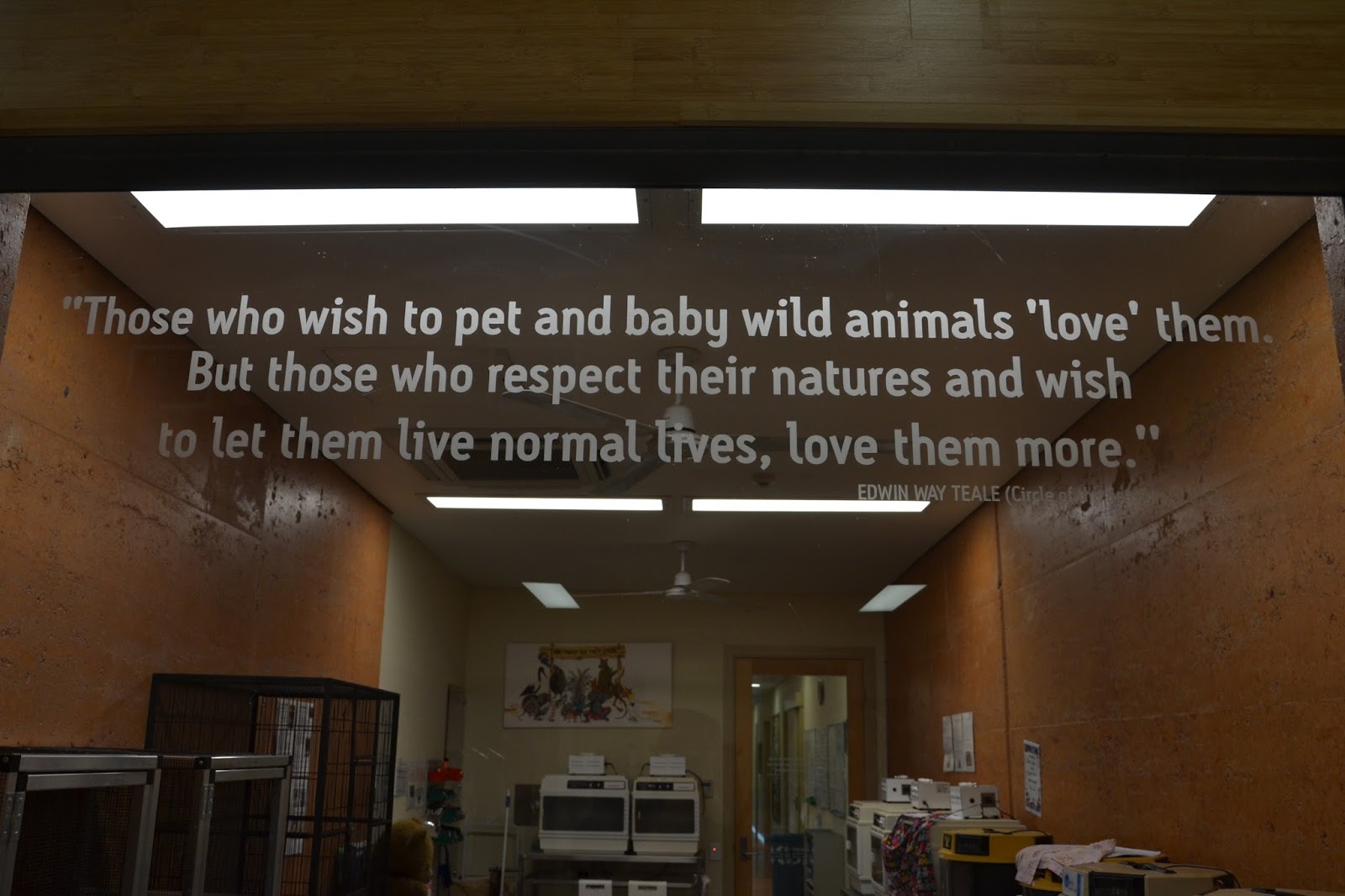 Eläinsairaalan sisäänkäynniltä. "Ne, jotka haluavat silittää ja helliä villieläimiä "rakastavat" niitä. Mutta ne, jotka kunnioittavat niiden luontoa ja haluavat niiden elävän niiden luontaisessa ympäristössä, rakastavat niitä enemmän."